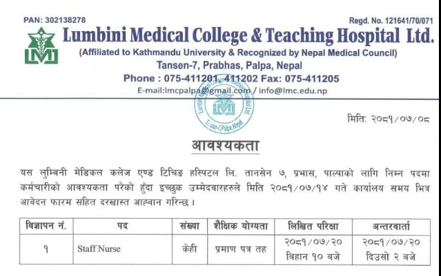 Lumbini Medical College & Teaching Hospital Staff Nurse Vacancy Announcement