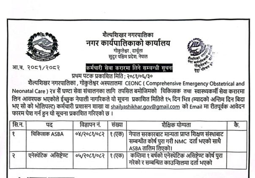 शैल्यशिखर नगरपालिका दार्चुलामा स्वास्थ्य कर्मचारी आवश्यकता सम्बन्धी सूचना