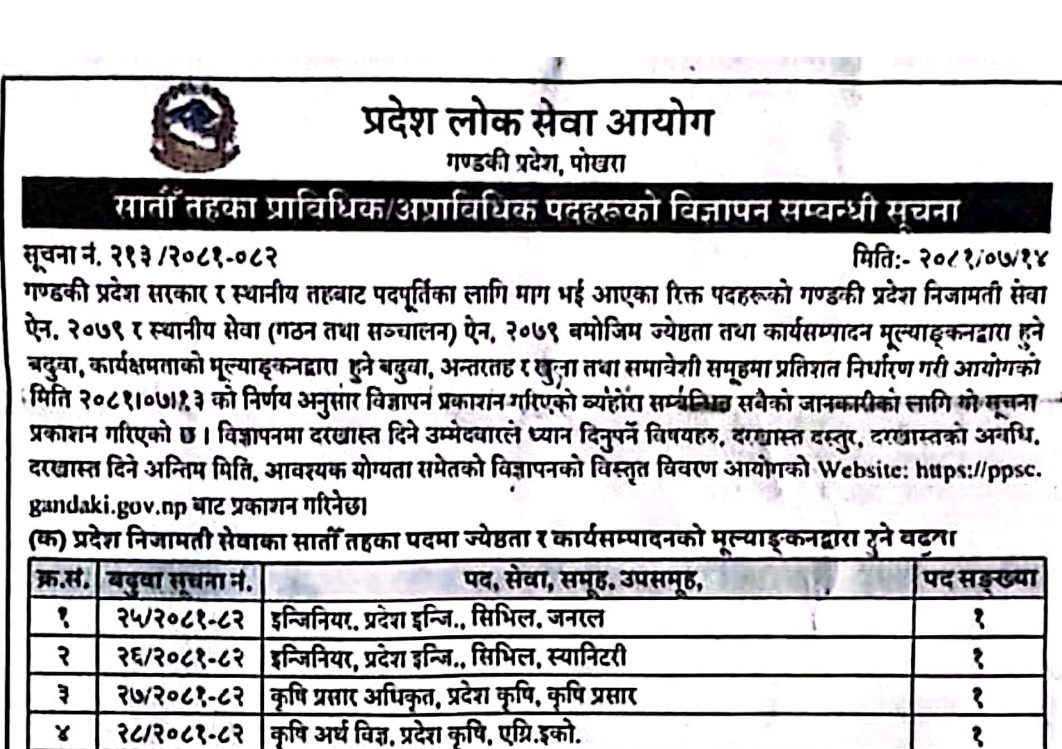 प्रदेश लोक सेवा आयोग गण्डकी प्रदेश, पोखराको स्वास्थ्य सेवा लगायतका सातौं तहका प्राविधिक/अप्राविधिक पदहरूको विज्ञापन सम्बन्धी सूचना !