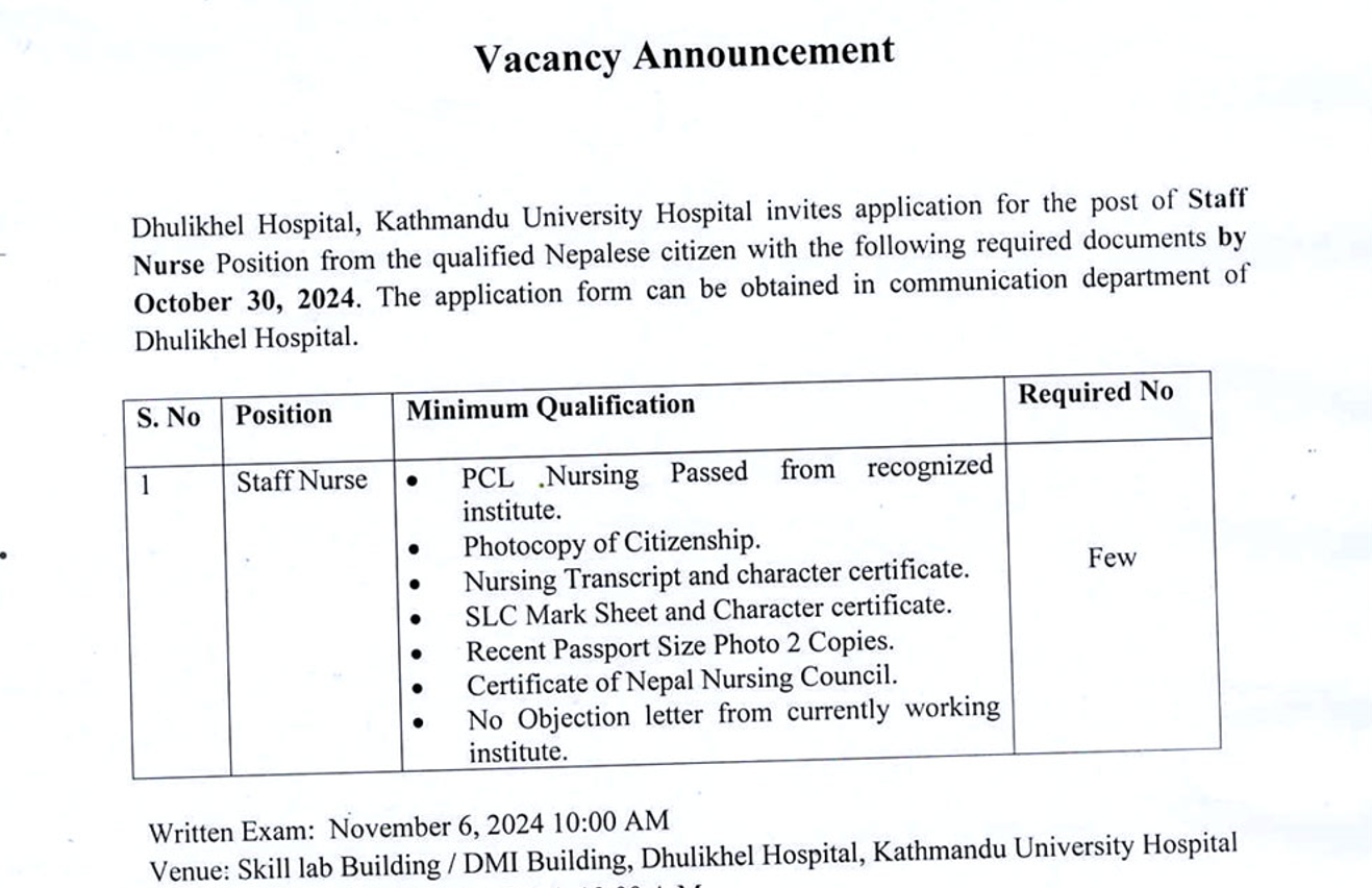 Vacancy Announcement For The Post Of Staff Nurse At Dhulikhel Hospital