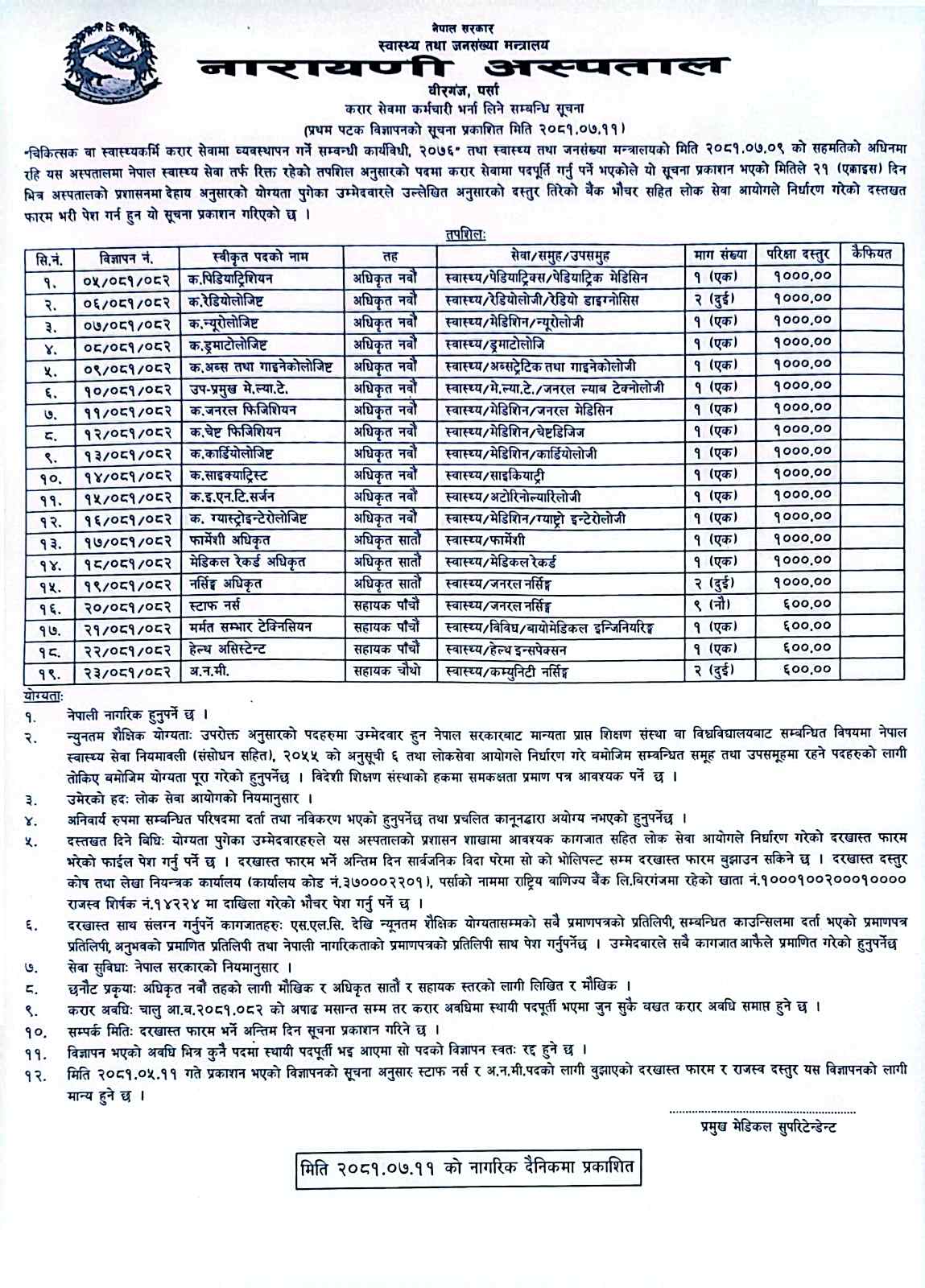नारायणी अस्पतालमा कर्मचारी आवश्यकता सम्बन्धी सूचना !