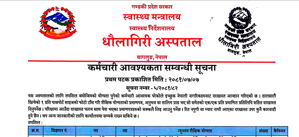 धौलागिरी अस्पतालमा चिकित्सक लगायत १८ जना स्वास्थ्यकर्मी आवश्यकता सम्बन्धी सूचना