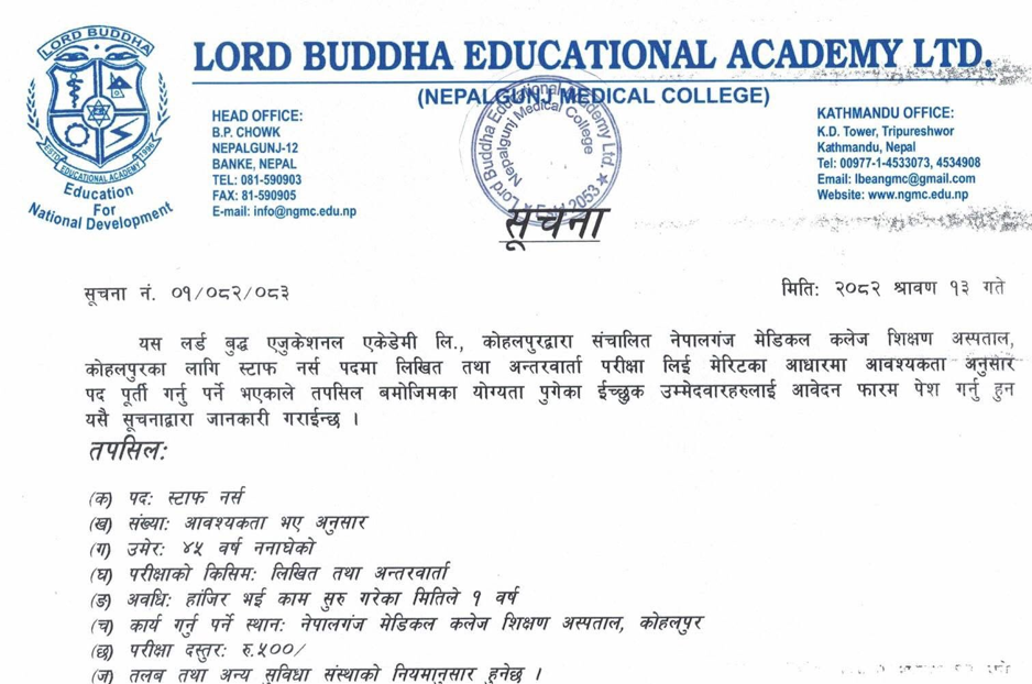 Staff Nurse Vacancy at Lord Buddha Educational Academy, Nepalganj Medical College