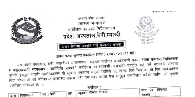 प्रदेश अस्पताल बेनी, म्याग्दीमा कर्मचारी आवश्यकता सम्बन्धी सूचना